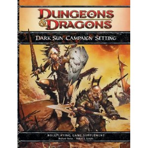 Every few Saturdays I’m playing a D&D 4th ed Dark Sun game. It’s pretty fun. More math than I enjoy, but that’s why I have an Alex to do my leveling for me. There are some awesome god damn things that happen when I roll a natural 20, though. I’ve been enjoying playing the meat shield, although it did take me a few sessions to get used to the idea of flinging myself into harm’s way because I have more hit points than God. I usually play sneaky, stabby, knife ’em in the back spy type characters.