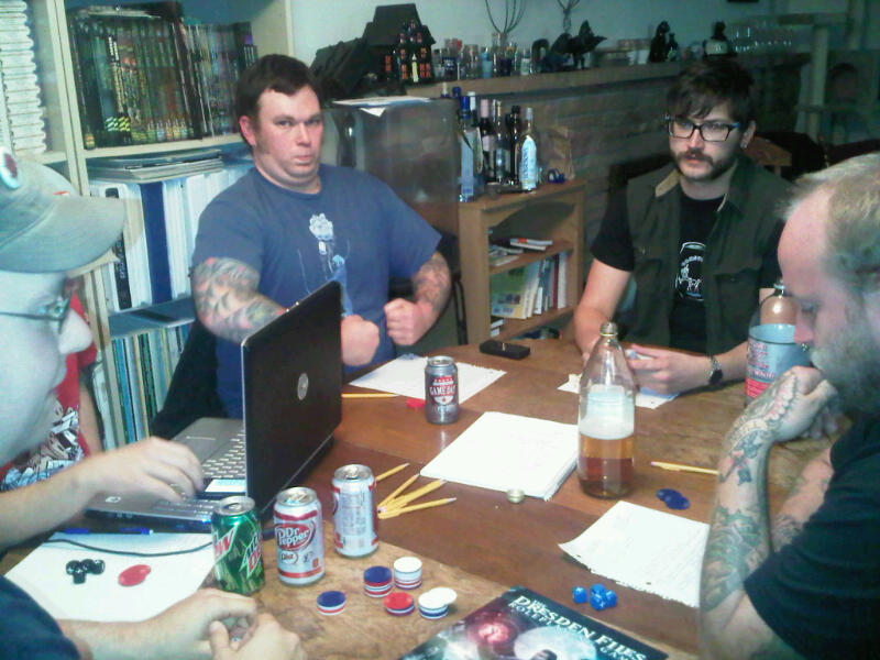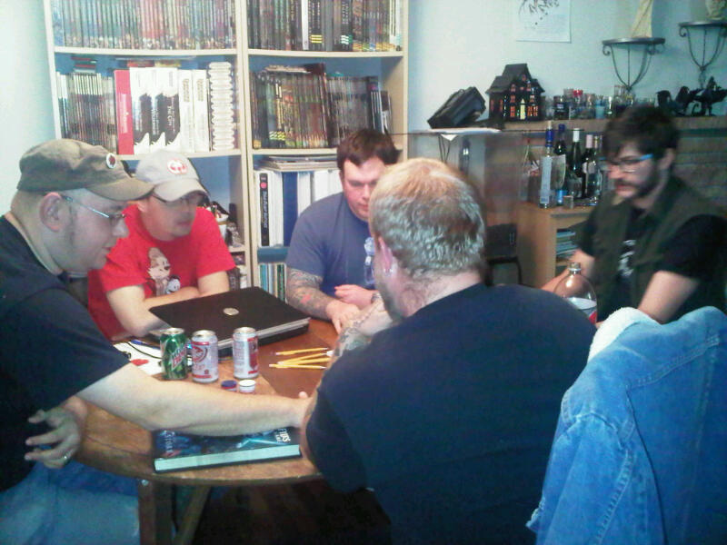 I am having the worst writer’s block in the history of writer’s block. I’ve got a couple of posts started, but about halfway through they fall apart, and then… feh. So, in lieu of that I’m posting pictures of the Geek Husband What Rules’s new gaming group.