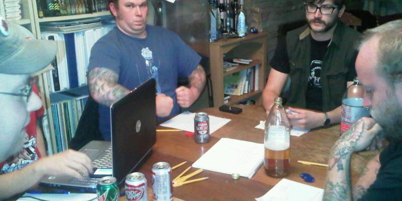 The new Punk Rock Gaming Super Group. In this picture Evan (a Geek Room-mate What Rules even if all you can see is his hand), Brian from Go! Fight! Win!, Jake from the Damage Done and Smooth Sailing, Ryan from the Damage Done and Jefferson Deathstar, and The Geek Husband What Rules, drummer for HoneyBadger.