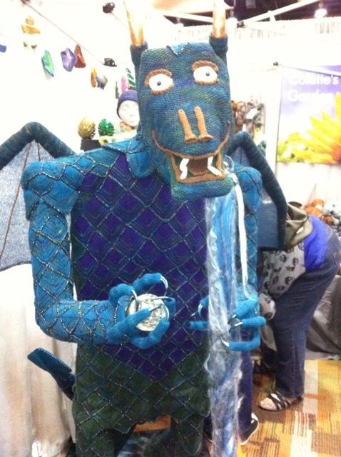 And the thing the kept me from blogging most of the today: Vogue Knitting Live. I did manage to keep myself to a fairly strict budget, and only come home with the yarn I need to knit a shark hat, and one extraneous but really gorgeous hank, and some double point needles. My mom bought me a really nice knitting bag as an early birthday present, and there were freebies. There was also a table of Octopusses (they ladies who had them also had a great yarnbombing zine and were super nice), and a five foot tall dragon knitted on size 3 needles. Unlike piercing jewelry, the smaller the number the smaller the needle. I typically refuse to do any project that calls for anything under a 6, and this woman knitted a person sized dragon on 3s.